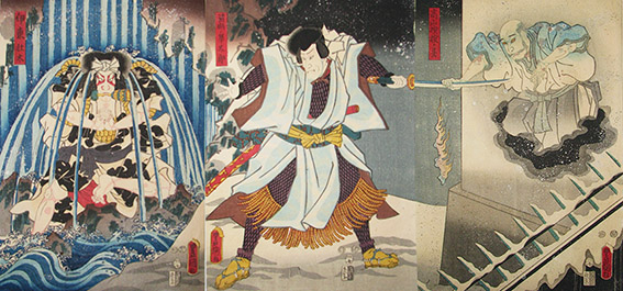 Puupiirroksessa on esitettynä jännittävä kohtaus suosikkinäytelmästä Hanano Saga Nekomata Zoshi, ”Sagan linnan kissakummitus”. Näytelmä sai ensi-iltansa Edossa, nykyisessä Tokiossa vuonna 1853. Sen juoni perustuu näytelmäkirjailija Segawa Joko III:n (1806-1881) vapaasti kehittelemiin tarinoihin 1600-luvulla eläneen lääninherra Nabeshima Mitsushigen (1632-1700) elämästä.